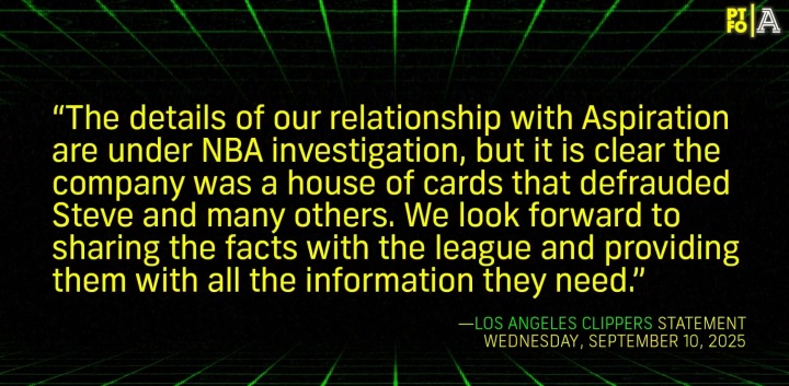 “我们与Aspiration的关系正处于NBA的调查之中,但很明显这家公司非常不稳定,他们欺骗了鲍尔默还有很多其他人。我们很期待能够与联盟分享事实,并提供他们所需的所有信息。”